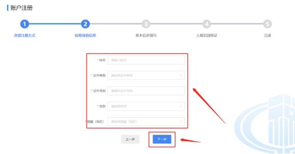 三、在校驗(yàn)身份信息頁(yè)面填寫姓名、證件類型、證件號(hào)碼、性別、國(guó)籍(地區(qū)), 點(diǎn)擊下一步,拖動(dòng)滑塊驗(yàn)證。