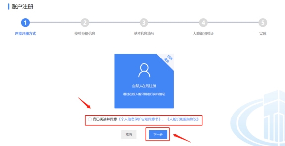 二、勾選“我已閱讀并同意《個(gè)人信息保護(hù)告知書》、《人臉識(shí)別服務(wù)協(xié)議》”,點(diǎn)擊“下一步”。