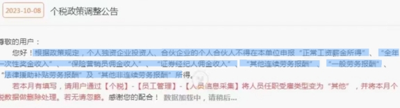除了上文說到的個(gè)人所得稅不能長(zhǎng)期零申報(bào)外,還有人收到了個(gè)稅調(diào)整公告:“根據(jù)政策規(guī)定,個(gè)人獨(dú)資企業(yè)投資人、合伙企業(yè)的個(gè)人合伙人不得在本單位申報(bào)"正常工資薪金所得”、"全次性獎(jiǎng)金收入”“保險(xiǎn)營(yíng)銷員傭金收入”“證券經(jīng)紀(jì)人傭金收入”、“其他連續(xù)勞務(wù)報(bào)酬”、“一般勞務(wù)報(bào)酬”法律援助補(bǔ)貼勞務(wù)報(bào)酬”及“其他非連續(xù)勞務(wù)報(bào)酬”所得。