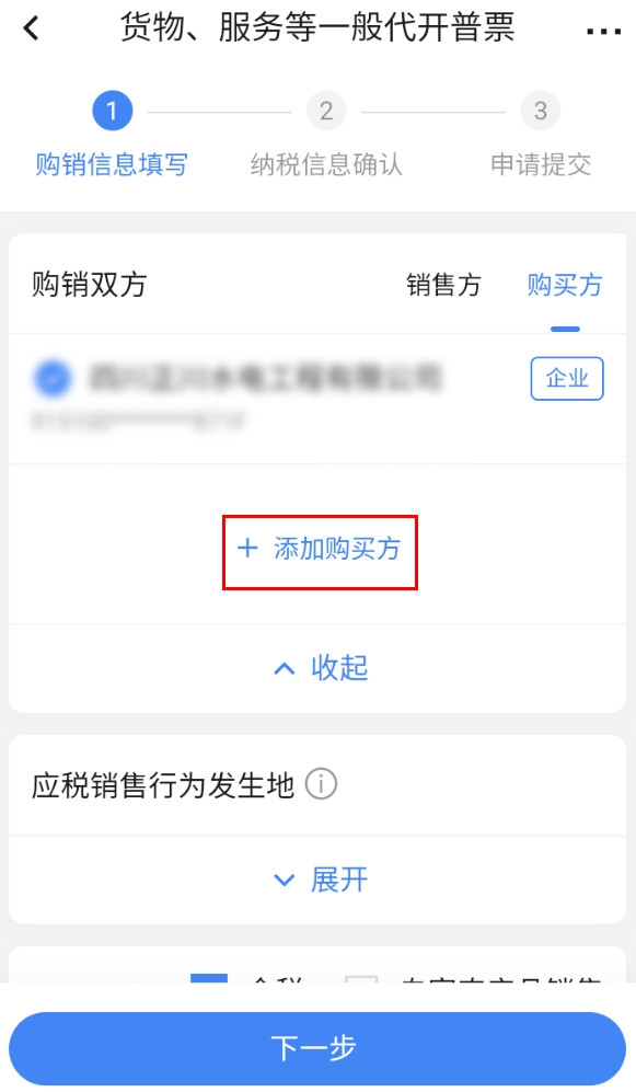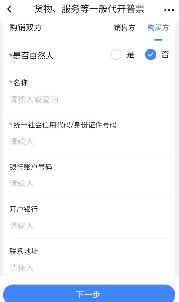 2.3、點(diǎn)擊“添加購買方”,選擇是否為自然人,錄入購買方信息:名稱、統(tǒng)一社會信息代碼/身份證件號碼、銀行賬戶號碼、開戶銀行、聯(lián)系地址、聯(lián)系電話、選擇是否展示銀行信息,點(diǎn)擊【保存】。名稱項為必填,其他項為選填。