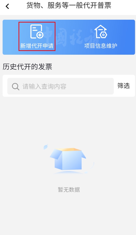 2.2、點(diǎn)擊【貨物、服務(wù)等一般代開】-【新增代開申請】進(jìn)入代開申請頁面。