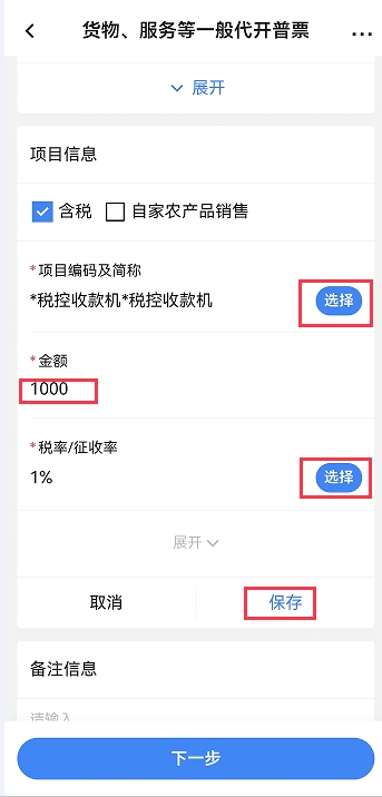 2.5、點(diǎn)擊“添加項目信息”錄入選擇項目編碼及簡稱、錄入金額,選擇稅率,點(diǎn)擊【保存】。