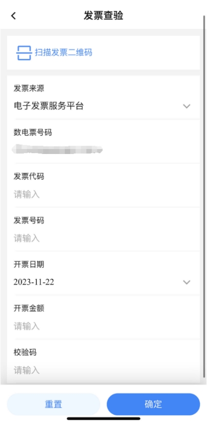 進入“發(fā)票查驗”頁面,可通過掃描已開具發(fā)票的票面二維碼帶出相關信息,也可在頁面手動錄入發(fā)票相關信息后點擊【確定】按鈕;若為本人發(fā)票,則只錄入發(fā)票號碼就可以查驗,若為第三方發(fā)票,則提示填入開票日期及開票金額(含稅金額)后進行查驗。
