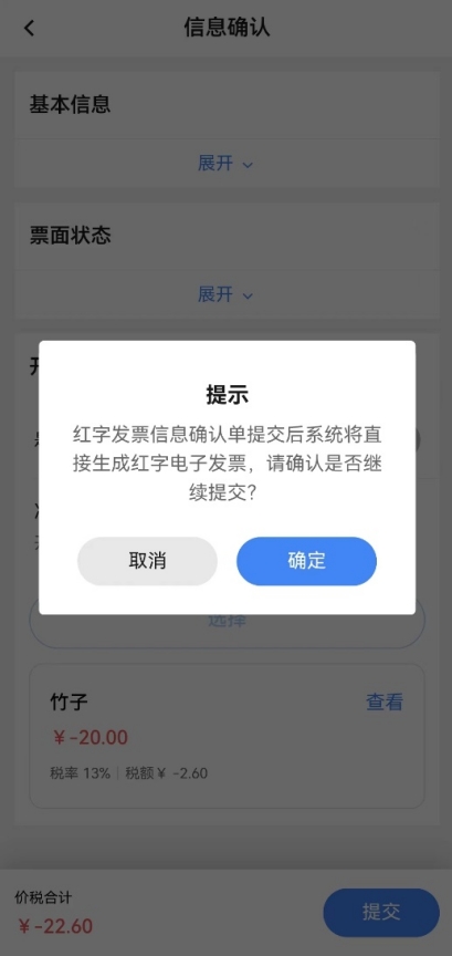 點擊【提交】按鈕,如藍字發(fā)票購買方未用票,系統(tǒng)彈出“紅字發(fā)票信息確認單提交后系統(tǒng)將直接生成紅字電子發(fā)票,請確認是否繼續(xù)提交”的提示。點擊【確認】,紅字發(fā)票開具成功,系統(tǒng)展示“開具結(jié)果”頁面,此頁面可查看開具的紅字發(fā)票,同時展示各個發(fā)票交付渠道,可按各渠道按鈕點擊后進行相應交付;如藍字發(fā)票購買方已用票,系統(tǒng)彈出“紅字發(fā)票信息確認單經(jīng)對方確認后系統(tǒng)將直接生成紅字電子發(fā)票,請確認是否繼續(xù)提交”提示,點擊【確認】,系統(tǒng)提示“提交成功”,同時自動跳轉(zhuǎn)到紅字發(fā)票確認信息錄入的查詢結(jié)果頁面。