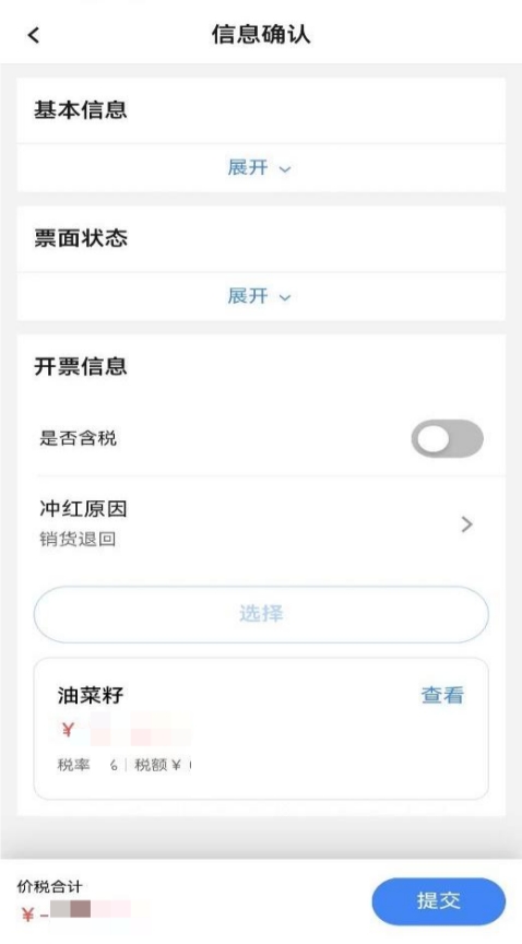 納稅人點擊要紅沖的藍字發(fā)票,進入“信息確認”頁面,此頁面從上至下可分為基本信息、票面狀態(tài)、開票信息。可通過點擊【展開】下拉按鈕查看購銷雙方基本信息和藍字發(fā)票的一些票面信息和藍字發(fā)票狀態(tài)等信息。開票信息中可通過點擊【紅沖原因】選擇具體的紅沖原因,下方顯示可紅沖的項目信息。點擊【查看】按鈕可顯示可紅沖項目的規(guī)格型號、數(shù)量、金額等具體信息。