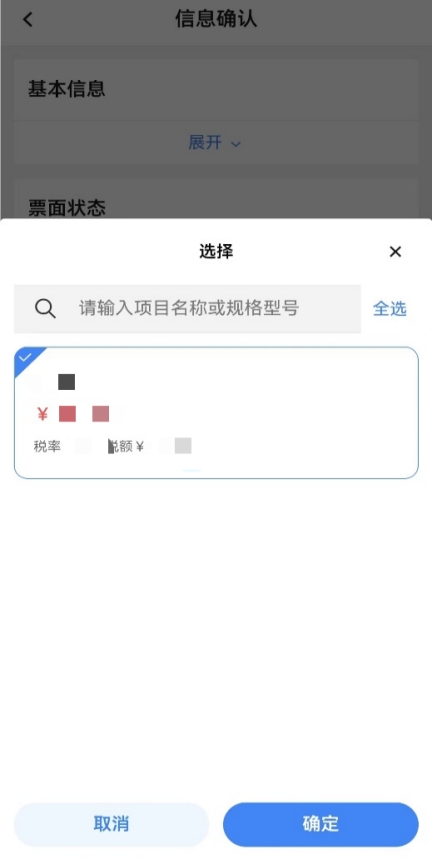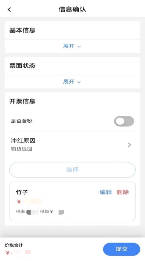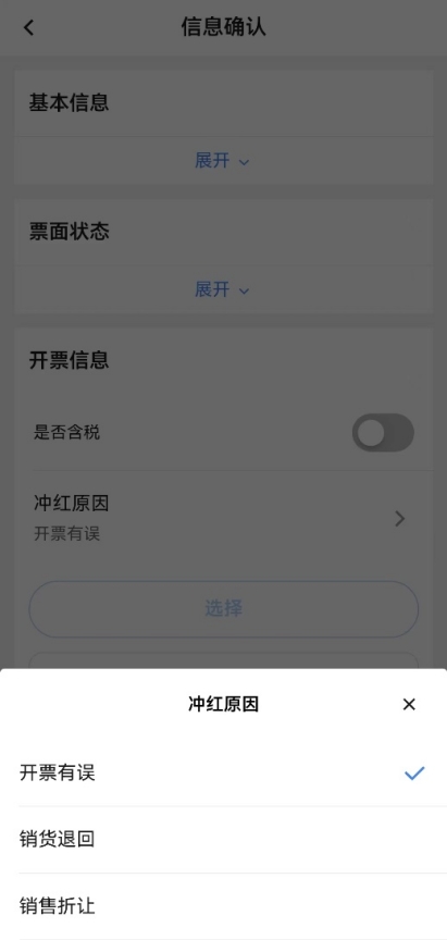 納稅人選擇具體的紅沖原因,系統(tǒng)可根據(jù)選擇的紅沖原因以及發(fā)票標簽控制允許納稅人修改項目信息詳情頁面數(shù)據(jù)。