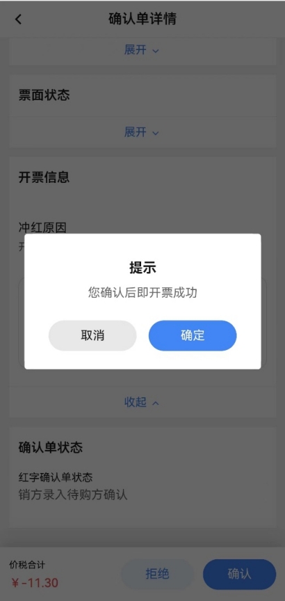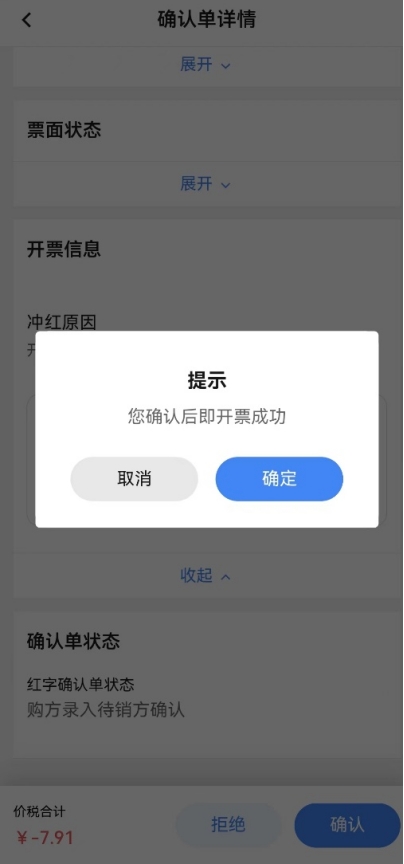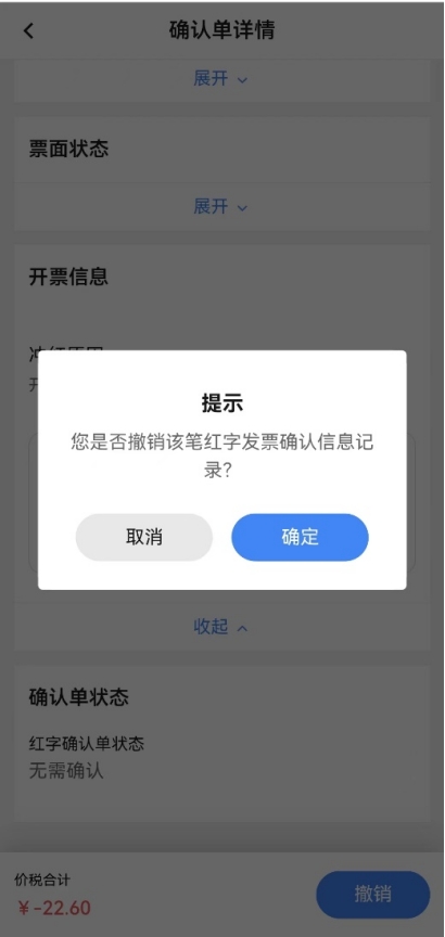 選擇需要處理的紅字信息確認單,點擊后進入“確認單詳情”頁面。無需確認的情況下銷方在紅字發(fā)票未開具前,點擊【撤銷】彈出撤銷提示,點擊【確定】成功撤銷此紅字信息確認單。需要雙方確認的場景發(fā)起方在對方未確認前,點擊【拒絕】彈出撤銷提示,點擊【確定】成功撤銷此紅字信息確認單。