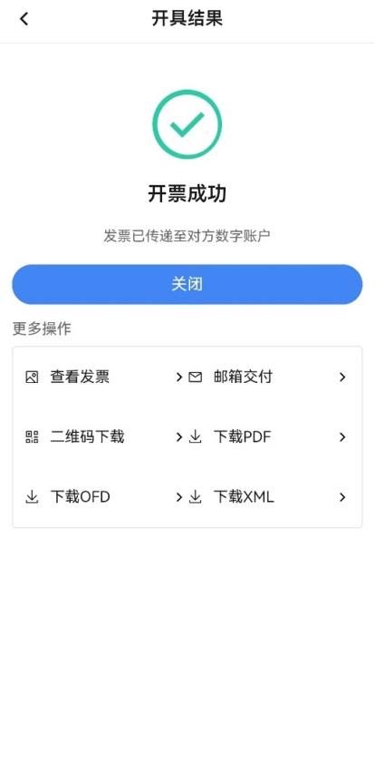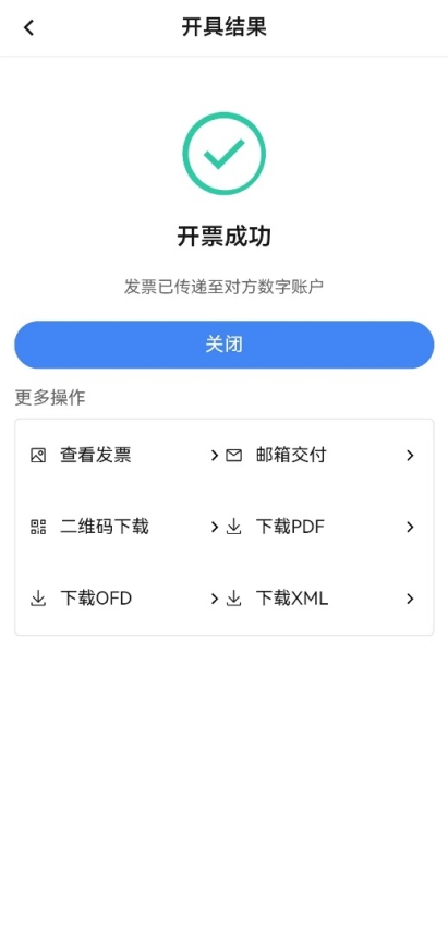 打開的確認單狀態(tài)為“購方錄入待銷方確認”時,點擊【確認】,彈出確認即開票提示,點擊【確定】,紅字發(fā)票開具成功,跳轉(zhuǎn)到“開具結(jié)果”頁面,此頁面可查看開具的紅字發(fā)票,同時展示各個發(fā)票交付渠道,可按各渠道按鈕點擊后進行相應交付。
