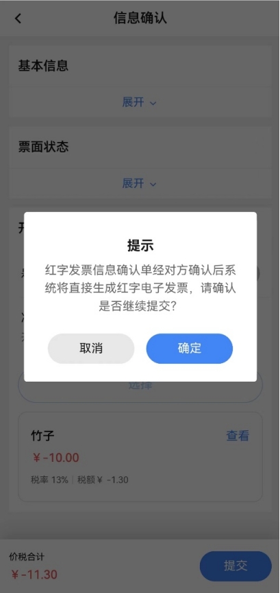 打開的確認單狀態(tài)為“銷方錄入待購方確認”時,點擊【確認】,彈出確認即開票提示,點擊【確定】,顯示“開具結(jié)果”頁面,紅字發(fā)票開具成功。