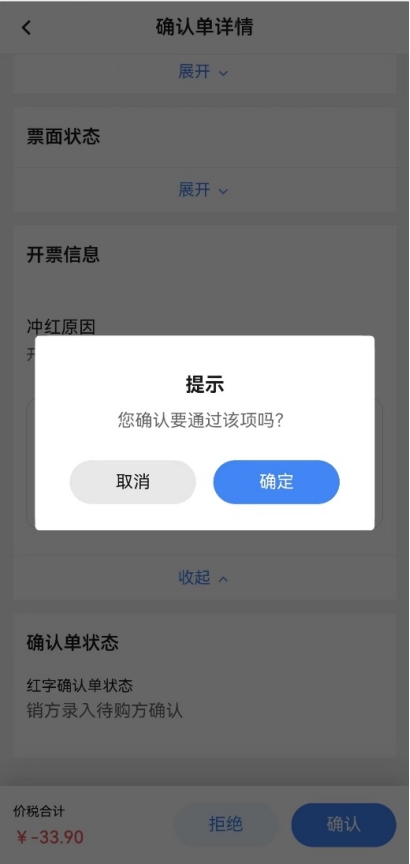 如藍字發(fā)票為web端開具的紙質(zhì)發(fā)票,在移動端發(fā)起確認單或在web端選擇“與原藍票一致票種的紙質(zhì)發(fā)票”發(fā)起確認單,在移動端確認時,點擊【確認】后,彈出“您確認要通過該項嗎?”的提示。點擊【確定】后,提示確認成功,還需在web端的【紅字發(fā)票業(yè)務】-【紅字發(fā)票開具】中點擊【去開票】才能成功開具紅字發(fā)票。