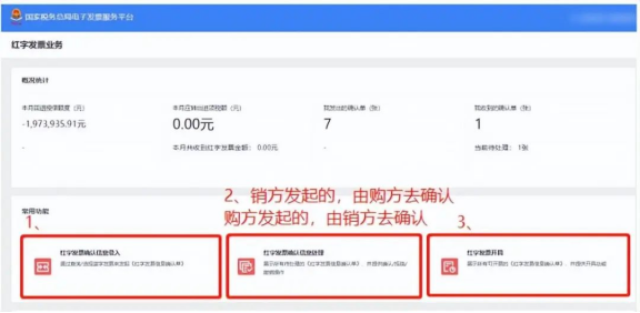 (紅字確認單經(jīng)過購銷雙方確認成功后,在[稅務(wù)數(shù)字賬戶] -[發(fā)票查詢統(tǒng)計] -[全量發(fā)票查詢] ,可以看到已經(jīng)開具成功的紅字發(fā)票,確認即開票,無需銷售方再行操作;或者銷方開具藍字發(fā)票后,藍字?jǐn)?shù)電發(fā)票的“增值稅用途標(biāo)簽”為空、“消費稅用途標(biāo) 簽”為“未勾選庫存”、“入賬狀態(tài)標(biāo)簽”為“未入賬”或“已入賬撤銷”的,由銷售方發(fā)起紅沖,不需對方確認,開具紅票)。
