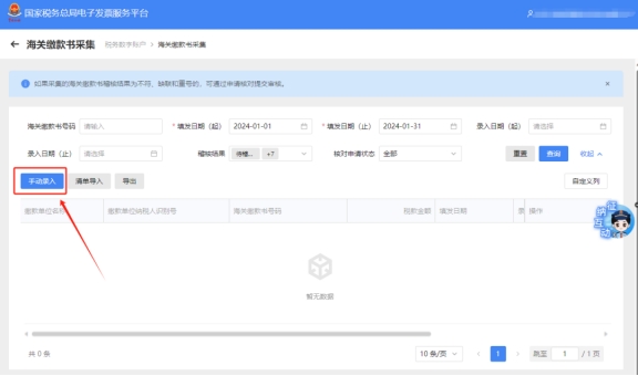 三、海關繳款書采集,點擊手動錄入。