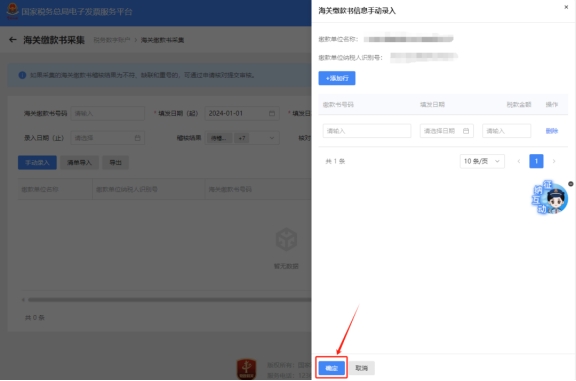 四、點擊【手動錄入】錄入海關繳款書信息,點擊“確定”成功后,稍后可在查詢界面根據(jù)需要輸入或選擇相關查詢條件,然后點擊“查詢”按鈕,在結果展示區(qū)顯示符合查詢條件的海關繳款書。