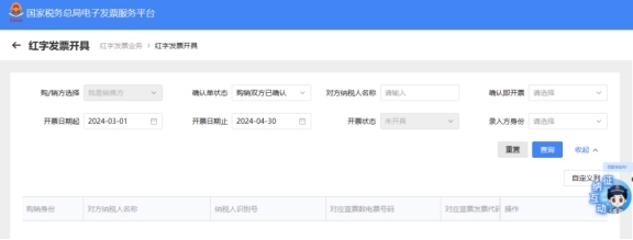 當(dāng)紅字信息確認(rèn)單狀態(tài)為購銷雙方已確認(rèn)狀態(tài)或無需確認(rèn)狀態(tài)時(shí),納稅人可依次進(jìn)入【我要辦稅】—【開票業(yè)務(wù)】—【紅字發(fā)票開具】頁面,在常用功能模塊中點(diǎn)擊“紅字發(fā)票開具”,錄入查詢條件查詢到此前開具的紅字信息確認(rèn)單,點(diǎn)擊右側(cè)的“去開票”,進(jìn)入紅字發(fā)票開具頁面,之后正常開具紅字發(fā)票即可。