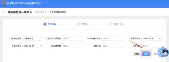 四、錄入查詢條件,點(diǎn)擊【查詢】按鈕,查詢需要紅沖的藍(lán)字發(fā)票信息。在查詢結(jié)果中點(diǎn)擊“選擇”后進(jìn)入【錄入紅字信息確認(rèn)單頁面】,在該頁面中若數(shù)電票票種選擇的是“電子發(fā)票”,點(diǎn)擊【提交】按鈕,提示:“尊敬的納稅人,您選擇紅字發(fā)票票種是“電子發(fā)票”,確認(rèn)方確認(rèn)后系統(tǒng)將直接生成紅字發(fā)票,請確認(rèn)是否繼續(xù)提交?”,點(diǎn)擊【確定】,紅字發(fā)票開具成功;若數(shù)電票票種選擇的是“與原藍(lán)票一致票種的紙質(zhì)發(fā)票”,點(diǎn)擊【確定】,跳轉(zhuǎn)到“提交成功”界面,提示紅字信息確認(rèn)單提交成功。