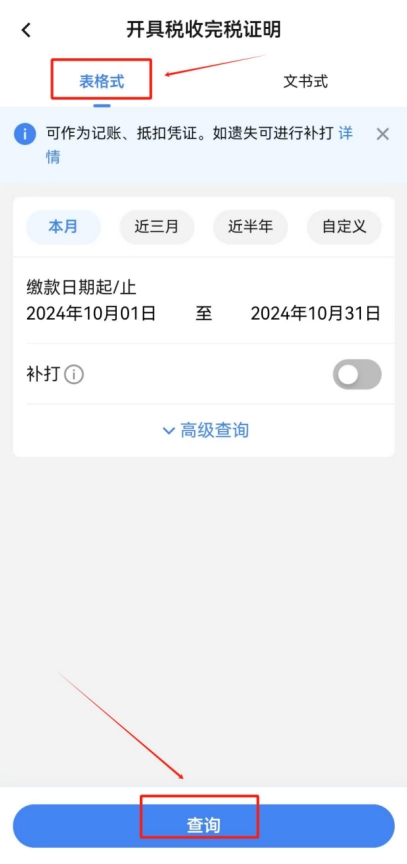 返回首頁(yè),點(diǎn)擊“開(kāi)具稅收完稅證明”,選中“表格式”后點(diǎn)擊下方“查詢”。