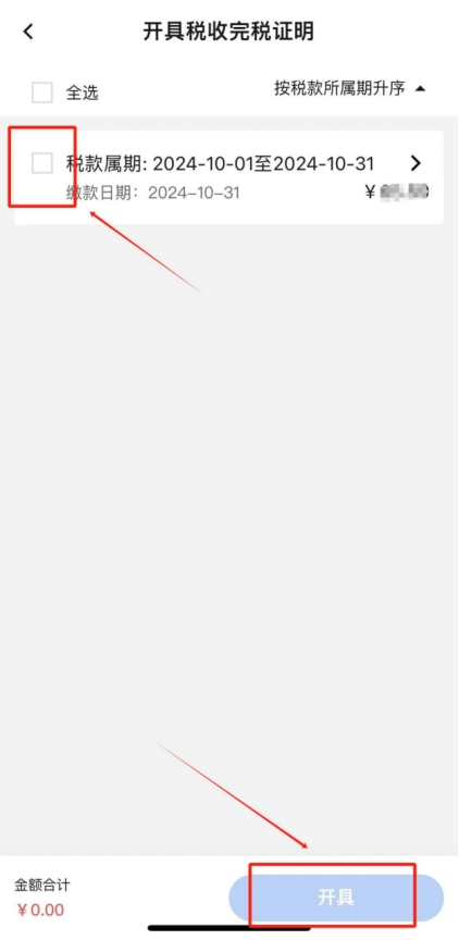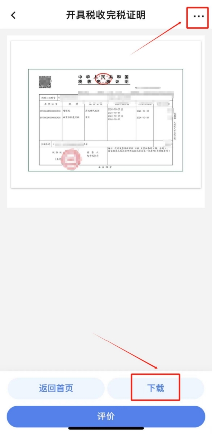 在查詢結(jié)果中勾選本次繳納的單筆稅款,點(diǎn)擊“開(kāi)具”,即可查看并下載完稅證明(如有需要,您可點(diǎn)擊完稅證明預(yù)覽頁(yè)面右上角“...”將發(fā)票分享至對(duì)方)。