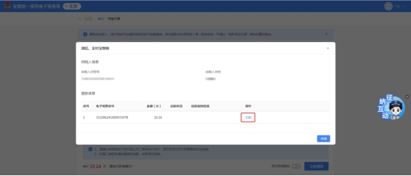 進(jìn)入后,可以看見(jiàn)自己審核通過(guò)的發(fā)票,可以查看詳情及繳稅,點(diǎn)擊繳稅,進(jìn)入繳稅流程。