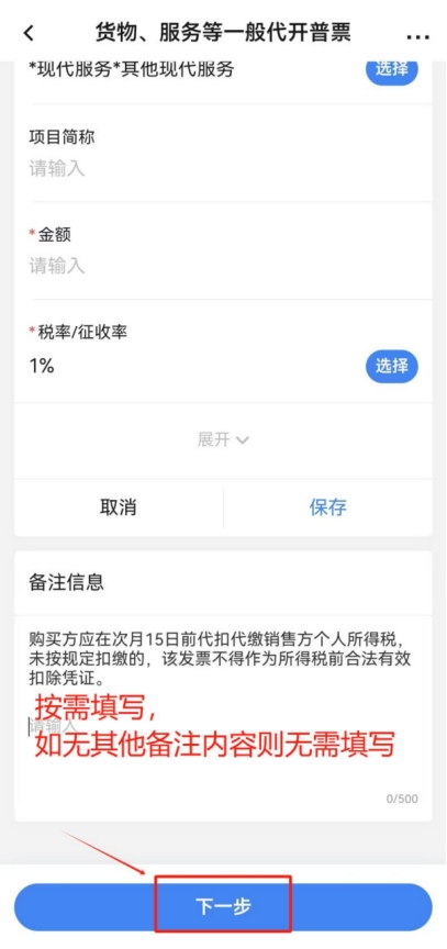 點(diǎn)擊“項(xiàng)目信息”一欄中的“添加項(xiàng)目信息”,“項(xiàng)目編號(hào)名稱”選擇“*現(xiàn)代服務(wù)*其他現(xiàn)代服務(wù)”,“項(xiàng)目簡(jiǎn)稱”按需據(jù)實(shí)填寫(例如:勞務(wù)費(fèi)/講課費(fèi)等),“金額”據(jù)實(shí)填寫開(kāi)票金額,“稅率/征收率”選擇“1%”,點(diǎn)擊“展開(kāi)”可填寫更多信息,可根據(jù)開(kāi)票需求自行選擇填寫(非必填項(xiàng)),填寫完成后點(diǎn)擊“保存”。