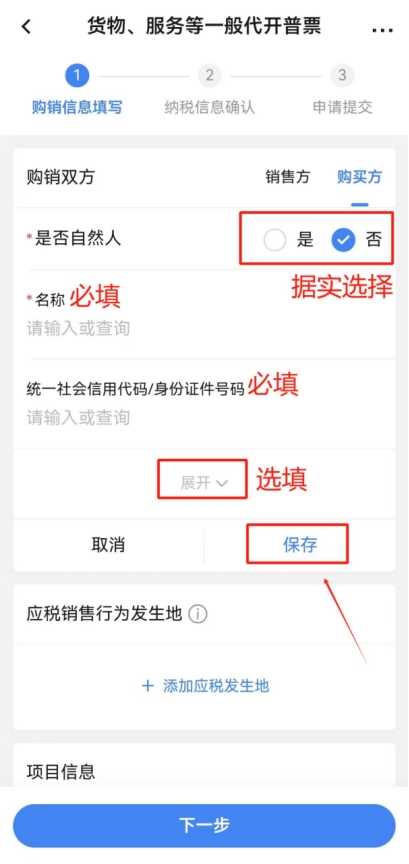點(diǎn)擊“購(gòu)銷雙方”一欄中的“銷售方”,核驗(yàn)個(gè)人身份信息是否正確(銷售方僅能為登錄APP的用戶本人),無(wú)誤后點(diǎn)擊“購(gòu)買方”,點(diǎn)擊“添加購(gòu)買方”,根據(jù)實(shí)際情況選擇“是否為自然人”并填寫“名稱”及“統(tǒng)一社會(huì)信用代碼/身份證件號(hào)碼”(點(diǎn)擊“展開(kāi)”可填寫更多信息,可根據(jù)開(kāi)票需求自行選擇填寫,非必填項(xiàng)),填寫完成后點(diǎn)擊“保存”。