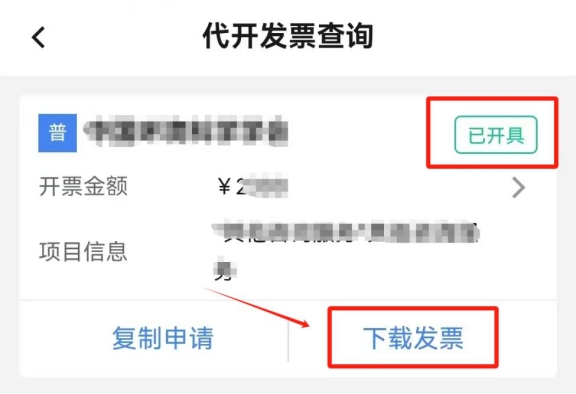 再次點(diǎn)擊首頁(yè)“代開(kāi)增值稅發(fā)票”,點(diǎn)擊“代開(kāi)發(fā)票信息查詢”,選擇提交申請(qǐng)的起止日期,點(diǎn)擊頁(yè)面下方的“查詢”。在查詢結(jié)果中找到本次提交的申請(qǐng),該條申請(qǐng)右上角狀態(tài)為“待開(kāi)具”,點(diǎn)擊“開(kāi)具發(fā)票”,右上角狀態(tài)變?yōu)椤耙验_(kāi)具”,點(diǎn)擊“下載發(fā)票”,即可查看并下載該發(fā)票(您可點(diǎn)擊發(fā)票預(yù)覽頁(yè)面右上角“...”將發(fā)票分享至對(duì)方)。