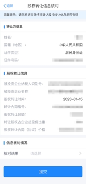 受讓方應認真核對股權轉讓信息,核對完成后選擇“核對結果”。若“核對無誤”則直接點擊“提交”,若選擇“核對有誤”則應填寫相應原因后點擊“提交”。對于受讓方確認不通過的,納稅人需根據受讓方反饋信息進行修改,并重新提交至受讓方確認;對于受讓方確認通過的,會自動轉入稅務機關受理審核環(huán)節(jié)。