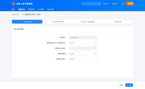 申報界面分為四個步驟,首先是錄入基本信息,在系統中錄入被投資企業(yè)統一社會信用代碼,選擇稅款所屬期、股權轉讓情形等。其次是錄入股權轉讓信息,該部分由“被投資企業(yè)信息”“股權轉讓方信息”“股權受讓方信息”及“附報資料”四部分組成,點擊“被投資企業(yè)信息”右側的“填寫”,進入填寫頁面。