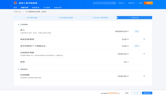 轉讓方申報的最后一個步驟,系統會自動根據前三步的填報數據,展示本次轉讓的計稅明細及需要繳納的個人所得稅。確認無誤后點擊“提交資料”,股權轉讓信息就會提交至受讓方進行核對。