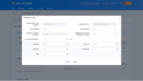 點擊“股權轉讓方信息”右側的“填寫”,進入填寫頁面。填報股權轉讓份額、轉讓股權占企業(yè)總股份比重、股權轉讓合同價格、股權原值、相關合理稅費,填寫完成后點擊“保存”,轉入下一步操作。