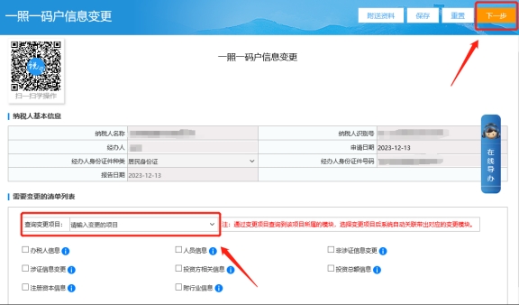 三、一照一碼戶登記信息變更頁面,在查詢變更項目中找相應(yīng)人員的移動電話,填寫變更后內(nèi)容,點擊下一步提交即可。