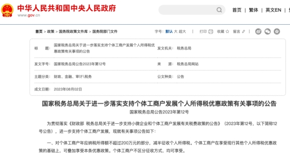 《國家稅務(wù)總局關(guān)于進(jìn)一步落實(shí)支持個體工商戶發(fā)展個人所得稅優(yōu)惠政策有關(guān)事項(xiàng)的公告》(國家稅務(wù)總局公告2023年第12號)