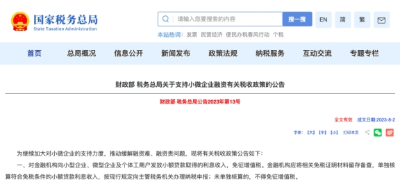 《財(cái)政部 稅務(wù)總局關(guān)于金融機(jī)構(gòu)小微企業(yè)貸款利息收入免征增值稅政策的公告》(財(cái)政部 稅務(wù)總局公告2023年第16號)