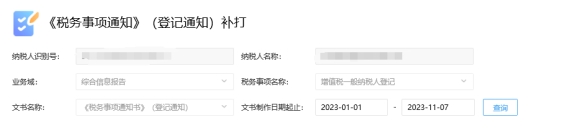 三、《稅務(wù)事項(xiàng)通知》(登記通知)補(bǔ)打界面,文書制作日期起:選擇一般納稅人生效年份的1月1日,文書制作日期止:選擇生效日期同年的12月31號(例:一般納稅人有效期起是2020-6-1,文書制作日期起是2020-1-1,文書制作日期止是2020-12-31)。