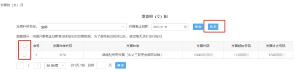 4、進(jìn)入“發(fā)票驗(交)舊”模塊,選中要驗舊的票種,點擊“驗舊”。