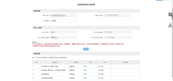 14、處理完畢重新點擊“注銷預(yù)檢”,未發(fā)現(xiàn)異常事項后,點擊“申請注銷”。
